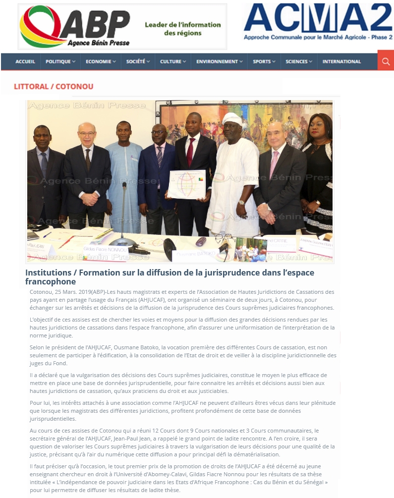 Le 22 mars, à l'issue de la première journée du séminaire, s'est déroulée en présence de la presse la cérémonie de remise du prix spécial 2018 de l’AHJUCAF à Gildas Nonnou enseignant-chercheur à l'Université d'Abomey-Calavi,pour sa thèse « L'indépendance du pouvoir judiciaire dans les Etats d'Afrique francophone : cas du Bénin et du Sénégal ».